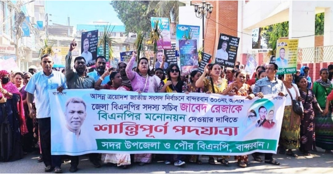 বান্দরবান–৩০০ নং আসনে বিএনপির মনোনীত প্রার্থী বাতিল করে স্থানীয় নেতা জাবেদ রেজাকে মনোনয়ন দেয়ার দাবিতে বিক্ষোভ পদযাত্রা